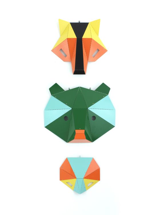 KOSMOS, Maski: „Miś”, „Wilk”, „Ptak”, 2011, proszkowo lakierowane aluminium, 54 cm x 42 cm x 12 cm (miś), 40 cm x 44 cm x 5 cm (wilk), 31 cm x 27 cm x 5 cm (ptak), estymacja 1 200-1 700 zł / KOSMOS, Masks: "Beard," "Wolf," "Bird", 2011, powder-coated aluminium, 54 cm x 42 cm x 12 cm (bear), 40 cm x 44 cm x 5 cm (wolf) 31 cm x 27 cm x 5 cm (bird), estimate 1 200-1 700 zł