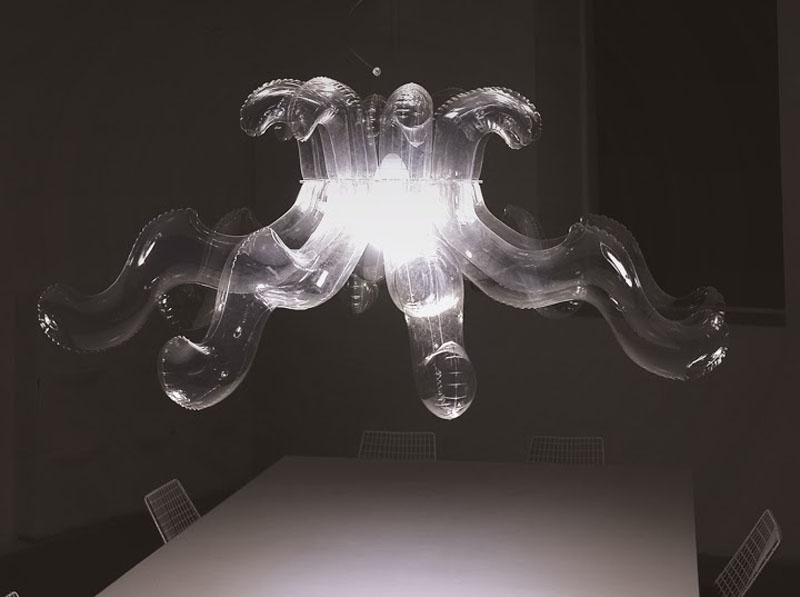 lampa złożona z ośmiu miękkich, pneumatycznych ramion z pcw podtrzymywanych przez stelaż z przezroczystego tworzywa, 55 x 90 cm