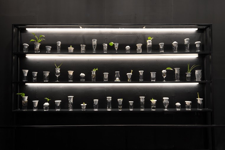 instalacja z elementów, czarna z metalowa konstrukcją, porcelana ręcznie toczona (szt), szkło (sygnowane i numerowane, podany nr edycji (szt), dokumentacja zdjęciowa w formie digital(szt) (nazwa ulicy gdzie szklanka została znaleziona przy każdym zd, 200 x 250 cm, śr.: 30 cm