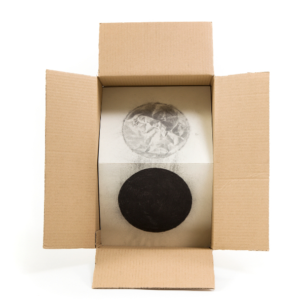 tekturowe pudełko a w nim rysunek wykonany węglem i grafitem na papierze naklejonym, 25 x 36 x 12,5 cm