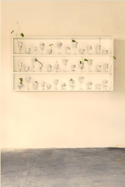32 szklane elementy, 32 porcelanowe elementy, porcelana, szkło, drewno, 90 x 150 x 22 cm