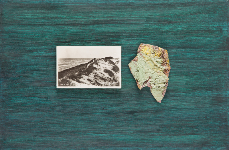 58.Tomasz Ciecierski - Bez tytułu 2013 r. olej, pocztówki/płótno, 33 x 53 cm sygnowany i datowany na odwrociu: 'T. Ciecierski | 2013 | oil/foto (pocztówki)' cena wywoławcza: 4 000 zł estymacja: 7 000 – 9 000zł