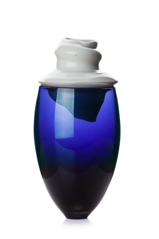 37.Alicja Patanowska - STRATUM Blue 2016 r. porcelana ręcznie toczona; szkło dmuchane, barwione, formowane z ręki, 30 x 10 x 10 cm sygnowany na podstawie: 'A 2016' cena wywoławcza: 2 000 zł estymacja: 3 000 – 6 000 zł